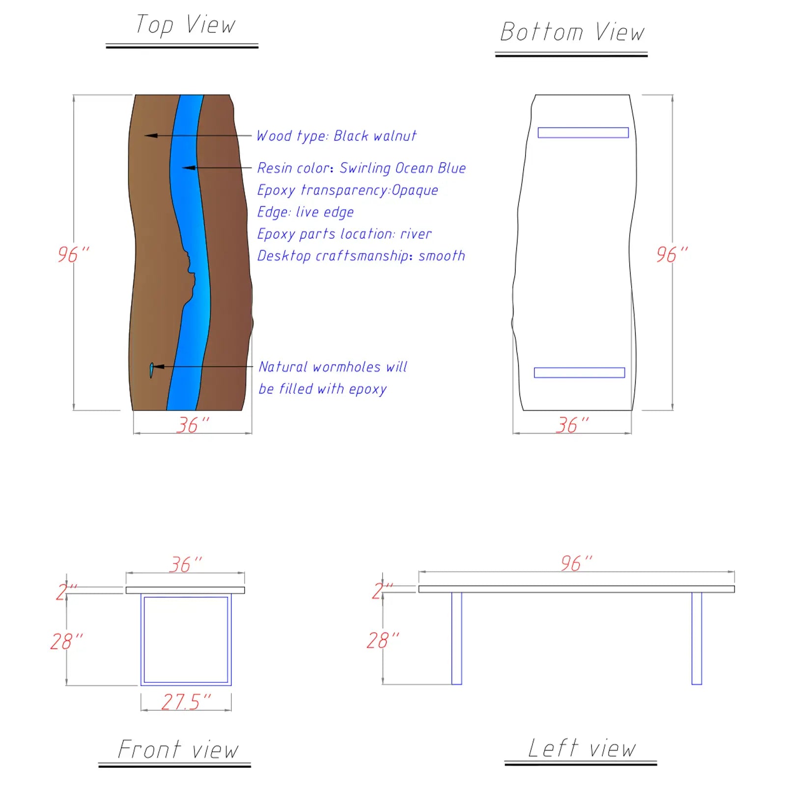 Mike H. from Griffin, GA wanted a custom office desk that reflected his love for speed, precision, and modern craftsmanship. Designed to sit beside his motorcycle, this piece needed to feel powerful, dynamic, and unmistakably personal.We crafted a custom desk from solid black walnut, measuring 36" × 96" × 2", featuring a flowing Swirling Ocean Blue epoxy river that captures a sense of motion and depth. Integrated LED lighting enhances the resin’s movement, creating a striking glow that shifts with the light. Finished with natural live edges, a high-gloss surface, and supported by the MTL05 metal base, this desk is more than a workspace—it’s a statement piece where craftsmanship meets freedom, energy, and modern design.